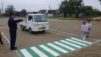 警察の方や交通指導員の方のお話を聞いて、道路の右側や横断歩道、遮断機のある線路の渡り方を学習しました。